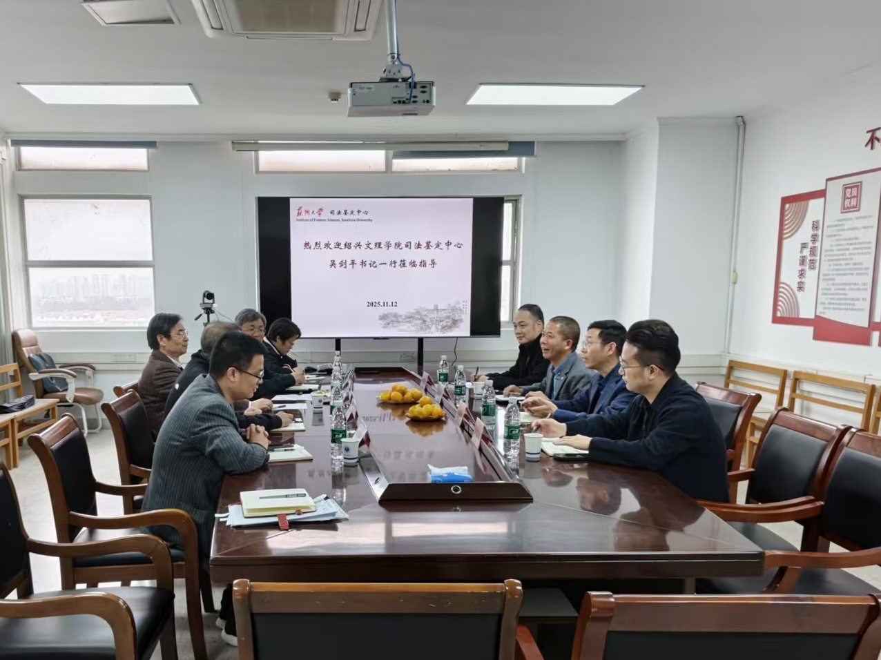 2025年11月12日,绍兴文理学院医学院党委书记、绍兴文理学院司法鉴定中心法定代表人、党支部书记吴剑平携绍兴文理学院司法鉴定中心机构负责人张登科、质量负责人严镇东、党支部组织委员简俊祺一行来我中心交流考察。苏州大学苏州医学院党工委书记王欣、副院长宋军、苏州大学司法鉴定中心主任朱少华、常务副主任张志湘、副主任杨娅热情接待。