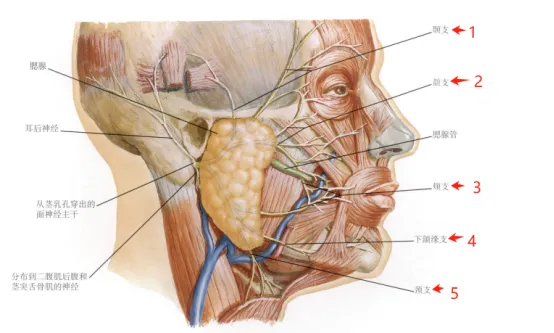 面神经经颞骨外段进人腮腺实质后分成五支:(1)颞支出腮腺上缘支配额肌和眼轮匝肌等;(2)颧支向前上支配眼轮匝肌和颧部肌肉;(3)颊支出腮腺前缘支配颊部肌肉以及口轮匝肌和口周围肌;(4)下颌缘支沿下颌骨下缘向前,支配面下份及下唇部肌肉;(5)颈支向下进入颈阔肌深面并支配该肌肉。