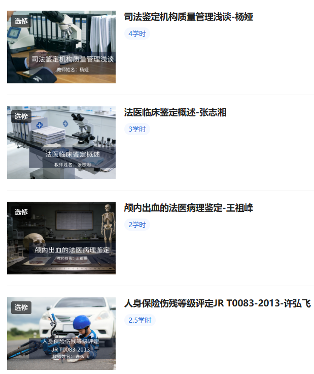 平台课程体系丰富,紧扣司法鉴定行业实操与发展需求,覆盖法医病理鉴定、法医毒物鉴定、法医临床鉴定、法医物证鉴定、痕迹鉴定、微量物证鉴定等多个核心鉴定类别,精准匹配不同岗位从业人员的学习需求,助力夯实专业基础、提升业务能力。